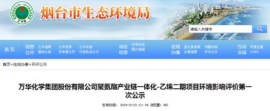 上月底,“萬華化學集團股份有限公司聚氨酯產業鏈一體化—乙烯二期項目”環境影響評價在網上公示。