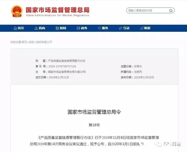 ????????11月26日,國家市場監督管理總局發布《產品質量監督抽查管理暫行辦法》,將自2020年1月1日起施行。《辦法》共56條,明確了監督抽查的組織、抽樣、檢驗、異議處理、結果處理及相關人員應承擔的法律責任,對于加強產品質量監督管理、規范產品質量監督抽查工作、保護消費者的合法權益有重要意義。