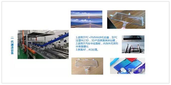 ????????二代淋涂設備主要應用于PC+PMMA手機后蓋,及PC注塑件2.5D,3D產(chǎn)品、汽車中控面板,內(nèi)飾件無異形件表面硬化、表面AF、AG處理。