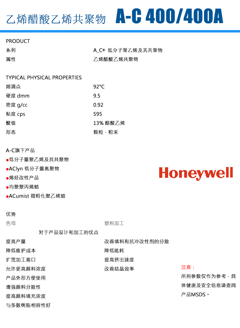 • 霍尼韋爾 honeywell EVA蠟 乙烯-醋酸乙烯共聚物蠟 AC-400A 顏料分散劑 物性表, 霍尼韋爾 honeywell EVA蠟 乙烯-醋酸乙烯共聚物蠟 AC-400A 顏料分散劑 產品參數,霍尼韋爾 honeywell EVA蠟 乙烯-醋酸乙烯共聚物蠟 AC-400A 顏料分散劑 性能表,霍尼韋爾 honeywell EVA蠟 乙烯-醋酸乙烯共聚物蠟 AC-400A 顏料分散劑 出廠報告, MSDS,, 物質安全資料表, UL黃卡,{ SGS報告, RoHS, 食品級認證, NSF飲用水標準, 產品資料, 產品性能, 出廠報告, 原廠原包, 代理商, 熱變形溫度, 熔指數, 流動系數, 抗沖擊性能、沖擊強度, 低溫韌性、低溫抗沖擊性能, 熔體流動系數、熔體流動速率, 加工工藝、加工參數、加工溫度, 歐盟RoHS 德國FDA 美國FDA 日本FDA