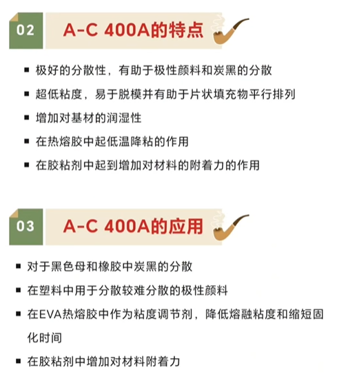 A-C 400A在EVA熱熔膠行業中,有廣泛應用,是的粘度調節劑。在配方中加入可以降低熔融粘度縮短固化時間,減少抽絲現象;可進一步改善熱熔膠的流動性和潤溫性;可防止熱熔膠存放結塊及表面發粘,但用量過多會使膠接強度下降,一般地加入量不超過30%。