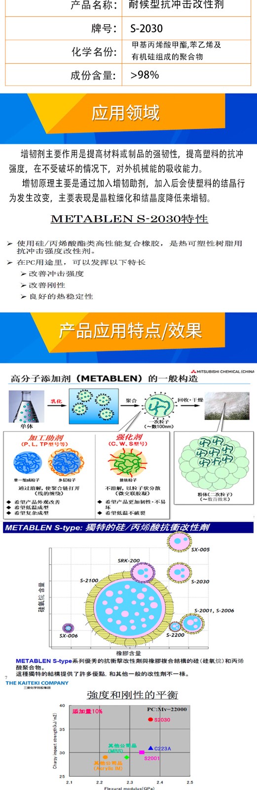 - 三菱增韌劑S2030 耐候耐寒(-50℃)增韌 高效防火 麗陽MBS S-2030 物性表, 三菱增韌劑S2030 耐候耐寒(-50℃)增韌 高效防火 麗陽MBS S-2030 產品參數,三菱增韌劑S2030 耐候耐寒(-50℃)增韌 高效防火 麗陽MBS S-2030 性能表,三菱增韌劑S2030 耐候耐寒(-50℃)增韌 高效防火 麗陽MBS S-2030 出廠報告, MSDS,, 物質安全資料表, UL黃卡,{ SGS報告, RoHS, 食品級認證, NSF飲用水標準, 產品資料, 產品性能, 出廠報告, 原廠原包, 代理商, 熱變形溫度, 熔指數, 流動系數, 抗沖擊性能、沖擊強度, 低溫韌性、低溫抗沖擊性能, 熔體流動系數、熔體流動速率, 加工工藝、加工參數、加工溫度, 歐盟RoHS 德國FDA 美國FDA 日本FDA