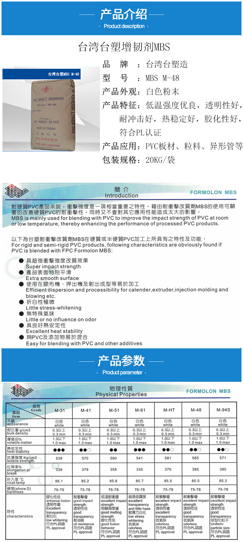 • 臺塑造MBS M48低溫強度好 透明MBS48 耐沖擊 PVC異形管增韌劑M-48 物性表, 臺塑造MBS M48低溫強度好 透明MBS48 耐沖擊 PVC異形管增韌劑M-48 產品參數,臺塑造MBS M48低溫強度好 透明MBS48 耐沖擊 PVC異形管增韌劑M-48 性能表,臺塑造MBS M48低溫強度好 透明MBS48 耐沖擊 PVC異形管增韌劑M-48 出廠報告, MSDS,, 物質安全資料表, UL黃卡,{ SGS報告, RoHS, 食品級認證, NSF飲用水標準, 產品資料, 產品性能, 出廠報告, 原廠原包, 代理商, 熱變形溫度, 熔指數, 流動系數, 抗沖擊性能、沖擊強度, 低溫韌性、低溫抗沖擊性能, 熔體流動系數、熔體流動速率, 加工工藝、加工參數、加工溫度, 歐盟RoHS 德國FDA 美國FDA 日本FDA