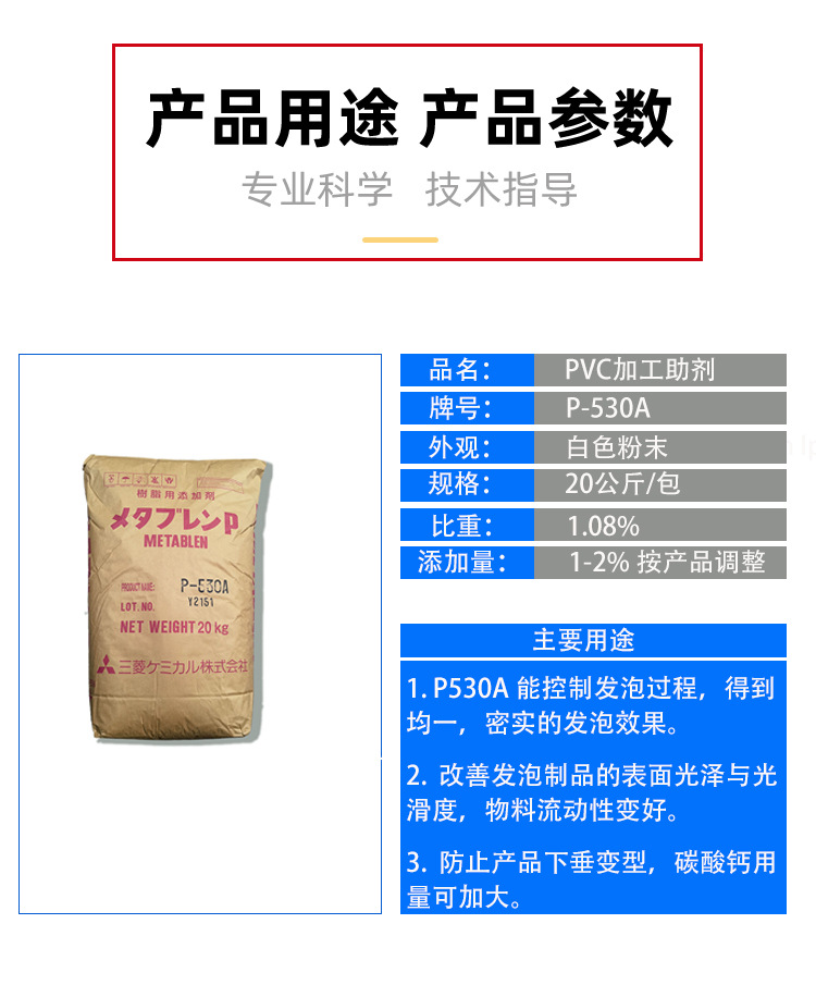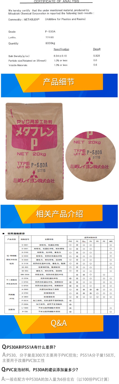 • P-530A日本三菱ACR增韌劑pvc助劑抗沖擊劑樹脂發泡改性劑 物性表, P-530A日本三菱ACR增韌劑pvc助劑抗沖擊劑樹脂發泡改性劑 產品參數,P-530A日本三菱ACR增韌劑pvc助劑抗沖擊劑樹脂發泡改性劑 性能表,P-530A日本三菱ACR增韌劑pvc助劑抗沖擊劑樹脂發泡改性劑 出廠報告, MSDS,, 物質安全資料表, UL黃卡,{ SGS報告, RoHS, 食品級認證, NSF飲用水標準, 產品資料, 產品性能, 出廠報告, 原廠原包, 代理商, 熱變形溫度, 熔指數, 流動系數, 抗沖擊性能、沖擊強度, 低溫韌性、低溫抗沖擊性能, 熔體流動系數、熔體流動速率, 加工工藝、加工參數、加工溫度, 歐盟RoHS 德國FDA 美國FDA 日本FDA