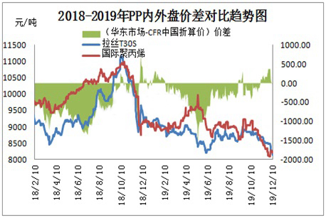 由2019年PP內外盤價差對比發現,12月份市場內外盤價格開始逐步扭轉局勢,主因目前國際聚丙烯裝置多套開車并不順利,如馬來西亞石油公司裂解裝置問題及俄羅斯西布爾裝置前期開車均出現短期不順利現象,同時西方國家面臨新年節日,多數生產企業開工負荷下降,導致國內到港資源偏緊。而國內市場因產能急劇上升及終端訂單跟進乏力制約,國內市場低價不斷頻現,從而內外盤價差逐步逆轉。