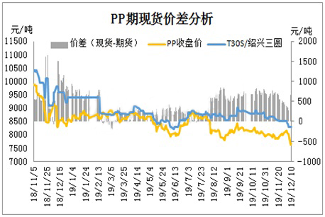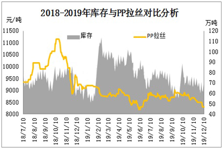 2019年12月庫存顯示整體呈現震蕩下滑趨勢,整體庫存維持在60-70萬噸/年,但全球經濟偏弱運行及國內實體企業訂單力度不及預期,市場原料消耗力度受到制約。同時2019年PP新一輪擴能高峰期再次來臨,浙江石化及大連恒力等大型聚烯烴裝置落地試運行,市場供需壓力更加凸顯,加快現貨市場拉絲下挫壓力。