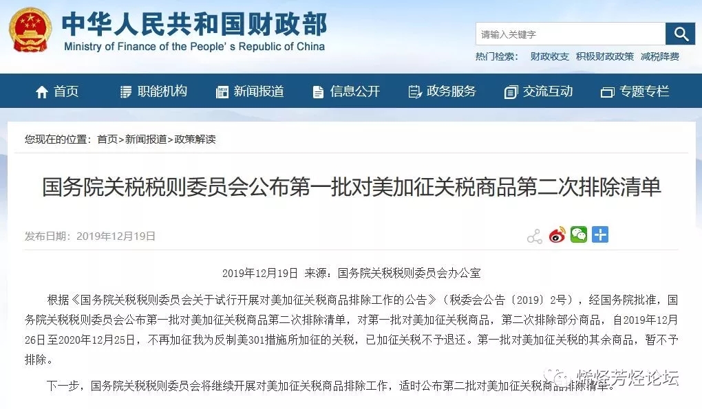 對附件清單所列商品,自2019年12月26日至2020年12月25日(一年),不再加征我為反制美301措施所加征的關稅。已加征的關稅稅款不予退還。