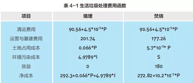 本文中的生活垃圾處置成本包括收集、運(yùn)輸、轉(zhuǎn)運(yùn)和處理成本,其中,垃圾處理相關(guān)費(fèi)用包括:垃圾清運(yùn)成本、運(yùn)營(yíng)和基建成本、土地占用成本、環(huán)境污染成本和效益,具體單位處理成本見(jiàn)表 4-1。垃圾填埋的環(huán)境成本包括垃圾填埋場(chǎng)主要的污染源——垃圾滲濾液的環(huán)境污染成本。焚燒處理的環(huán)境成本系通過(guò)疾病成本法來(lái)核算二噁英致癌成本。效益指垃圾焚燒發(fā)電收入;
