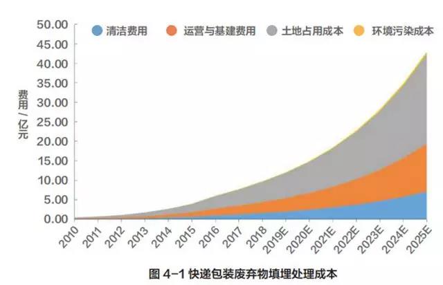 用此方法估算,平均每噸快遞垃圾填埋所需的處理費(fèi)用為 705 元,其中填埋場(chǎng)占用土地產(chǎn)生的成本較大。以2018 年為例,填埋 138.13 萬(wàn)噸快遞垃圾需垃圾處理費(fèi)用 9.74 億元,其中土地占用成本 5.22 億元、運(yùn)營(yíng)與基建費(fèi)用 2.79 億元、清運(yùn)費(fèi)用 1.61 億元,環(huán)境污染成本 1265 萬(wàn)元。若不采取有效的措施,至 2025 年我國(guó)填埋快遞包裝將達(dá)到 608.71 萬(wàn)噸,處理費(fèi)用達(dá) 42.92 億元;