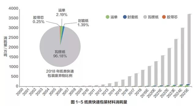 本研究采用物質(zhì)流分析方法,研究表明,我國(guó)各類快遞包裝材料消耗量從 2000 年;的 2.06 萬(wàn)噸增長(zhǎng)到 2018 年的 941.23 萬(wàn)噸。若不施行有效的措施予以控制,依當(dāng)前快遞行業(yè)的發(fā)展趨勢(shì),2025 年我國(guó)快遞包裝材料消耗量將達(dá)到4127.05 萬(wàn)噸,帶來(lái)龐大的資源負(fù)擔(dān)和環(huán)境壓力。按照材質(zhì)類型,可將快遞包裝材料分為紙質(zhì)類和塑料類。2018 年我國(guó)共消耗紙質(zhì)類快遞包裝材料856.05 萬(wàn)噸,占快遞包裝材料的 90.95%,塑料類包裝材料85.18萬(wàn)噸,占快遞包裝材料的9.05%。