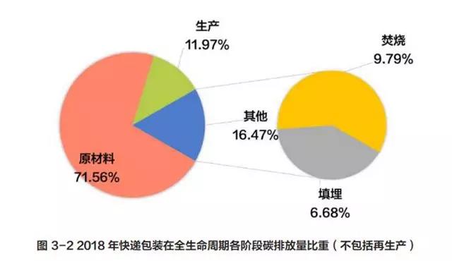 從圖 3-2 和圖 3-3 中可知,在 2018 年我國(guó)快遞包裝材料在生命周期各階段中(不包括再生),原材料階段(71.56%)的碳排放所占比重大,處置階段占比重較小(焚燒 9.79%,填埋6.68%),生產(chǎn)階段(11.97%)占比小。