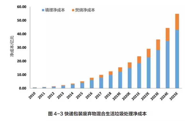 平均焚燒 1 噸快遞垃圾所需費(fèi)用 511 元,根據(jù)住建部發(fā)布的《中國(guó)城市建設(shè)統(tǒng)計(jì)年鑒》,2016 年我國(guó)生活垃圾填埋比例高達(dá) 60%,而焚燒比例為 38%,依此比例推算,2018 年快遞包裝焚燒量為 81.27 萬(wàn)噸,處理費(fèi)用也增至 4.15 億元。雖然生活垃圾焚燒發(fā)電產(chǎn)生了部分經(jīng)濟(jì)效益,但效益遠(yuǎn)低于成本。2018 年垃圾焚燒效益雖達(dá)到 1.46 億元,但凈成本也增長(zhǎng)到了 2.69 億。