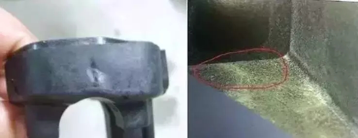 ????????但在玻纖增強(qiáng)尼龍注射成型過程中,“浮纖”現(xiàn)象經(jīng)常出現(xiàn)。浮纖現(xiàn)象是玻纖外露造成的。白色的玻纖在塑料熔體充模流動(dòng)過程中浮露于外表,待冷凝成型后便在塑料件表面形成放射狀的白色痕跡,當(dāng)塑料件為黑色時(shí)會(huì)因色澤的差異加大而更加明顯。
