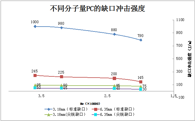 ????????PC樣條的厚度由3.18mm增加到6.35mm時,各分子量PC的缺口沖擊強度數值下降為原來的20%-25%左右。將樣條缺口由標準缺口改為尖銳缺口時,沖擊強度數值呈現大幅下降,3.18mm樣條各PC下降到不足原來10%,;而6.35mm樣條尖銳缺口的沖擊數值下降到原來標準缺口的1/5左右,均表現出脆性。可見,PC對厚度、尤其是缺口有較強的敏感性,PC分子量較高時這種敏感性稍有減弱。