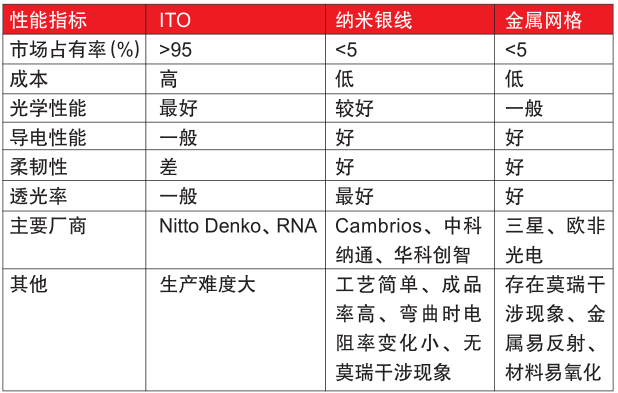 ????????納米銀線是一種直徑在納米范圍(一般在20-100納米之間)、長度沒有限制的金屬銀一維纖維。納米銀線具有體積小、比表面積大、良好化學(xué)性能和催性能、導(dǎo)電性能、抗菌性能和生理相容性,具體如表4所示。納米銀線的生產(chǎn)方法有:模板輔助、多元醇、光波輻射、軟化學(xué)溶劑熱等,多元醇法由于操作簡單、生產(chǎn)效率高、成本低廉成為當(dāng)前主流生產(chǎn)方法,缺點(diǎn)是產(chǎn)品濃度低。例如納米銀線可以生產(chǎn)透明柔軟塑料導(dǎo)電膜,具體結(jié)構(gòu)為基材為PET薄膜,涂覆層為納米銀線分散液,表層為丙烯酸保護(hù)涂層。基材為支撐層,中間涂層為透明導(dǎo)電層,保護(hù)層為保護(hù)銀不被氧化降低導(dǎo)電性能,主要替代ITO和金屬網(wǎng)透明導(dǎo)電薄膜。
