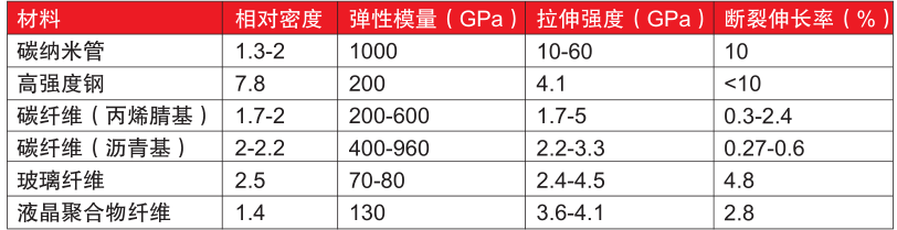 ????????碳納米管是一種理想的一維模型材料,巨大的長徑比使其具有類似碳纖維的性能,即高強(qiáng)度、高模量。其重量為鋼的1/6,強(qiáng)度為鋼的100倍,比強(qiáng)度為鋼的600倍,具體見表2所示。