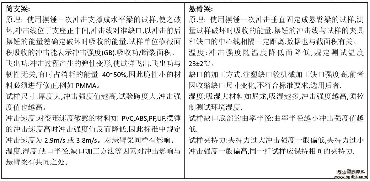 沖擊試驗的測試標準有 ISO179 塑料-簡支梁沖擊性能的測定、ISO 180 塑料-懸臂梁沖擊性能測定、ASTM D256 塑料-懸臂梁沖擊性能測定。ISO 標準的沖擊強 度單位是 kJ/m2;ASTM 標準的沖擊強度單位是 J/m。
