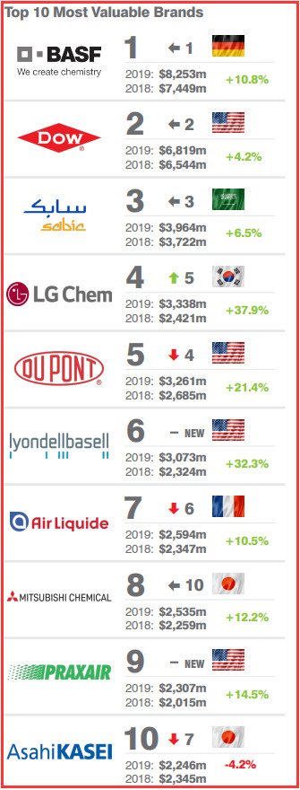 韓國LG化學(xué)的增長速度最快,其品牌價(jià)值增長了38% ,達(dá)到33億美元,從第五位提升到第四位,超過杜邦。